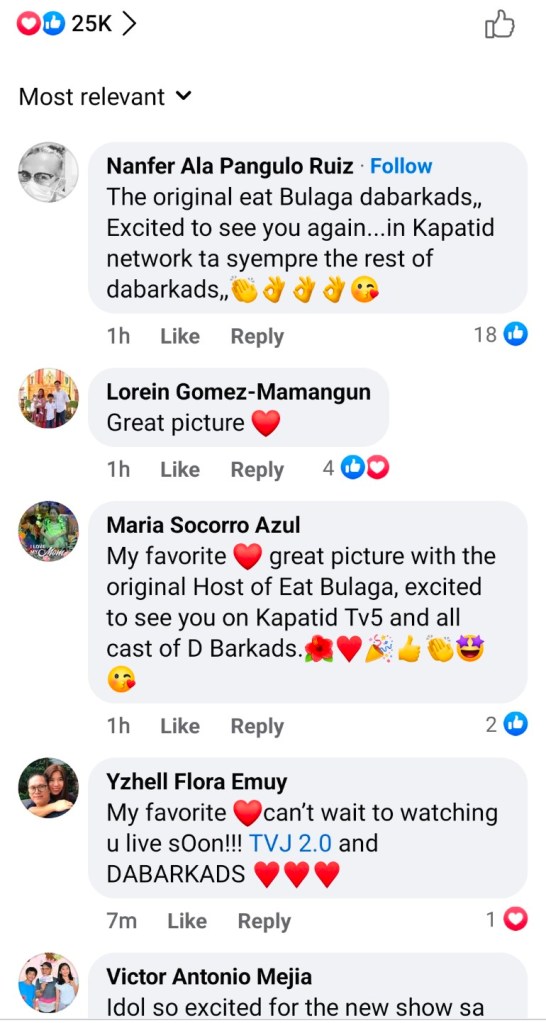 Nanfer Ala Pangulo Ruiz exclaimed, “The original Eat Bulaga Dabarkads. Excited to see you again…in Kapatid network, of course, along with the rest of the Dabarkads!”