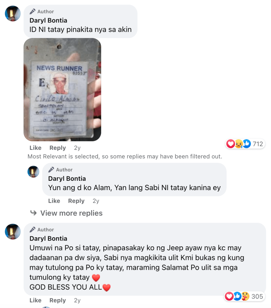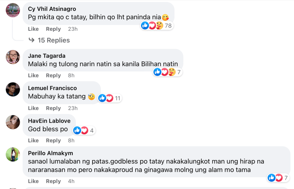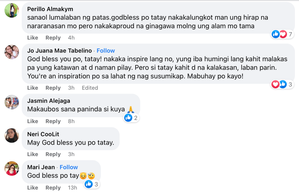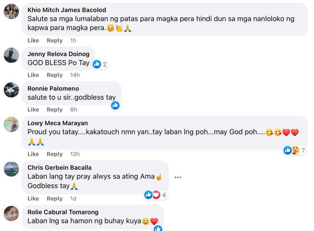 Another compassionate soul named Perilloi Almakym expressed, “I hope you continue to fight fairly. God bless you, tatay. It breaks my heart to see the hardships you endure, but it makes me proud to witness your unwavering dedication to doing what you believe is right.”