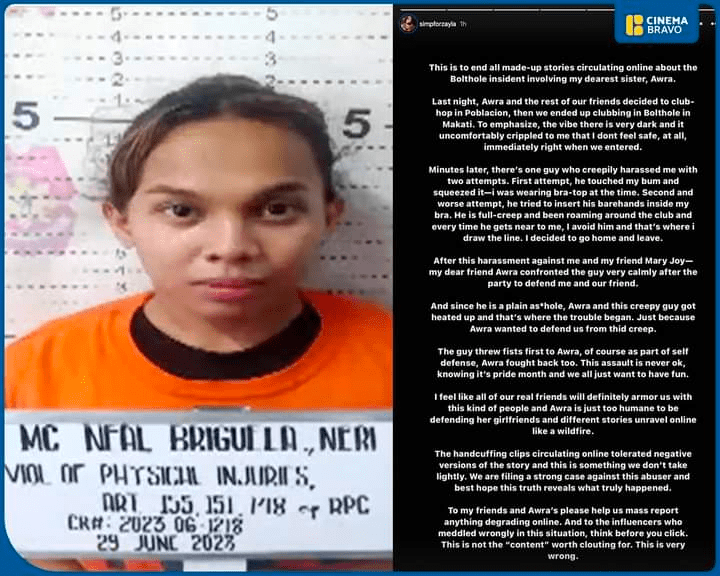 Awra spent the night in the precinct after being apprehended by Makati City Police officers from the Southern Police District in the early hours of June 29 outside the Bolthole Bar in Poblacion, Makati City. She is facing charges of physical injuries, alarm and scandal, disobedience to authority, and direct assault.