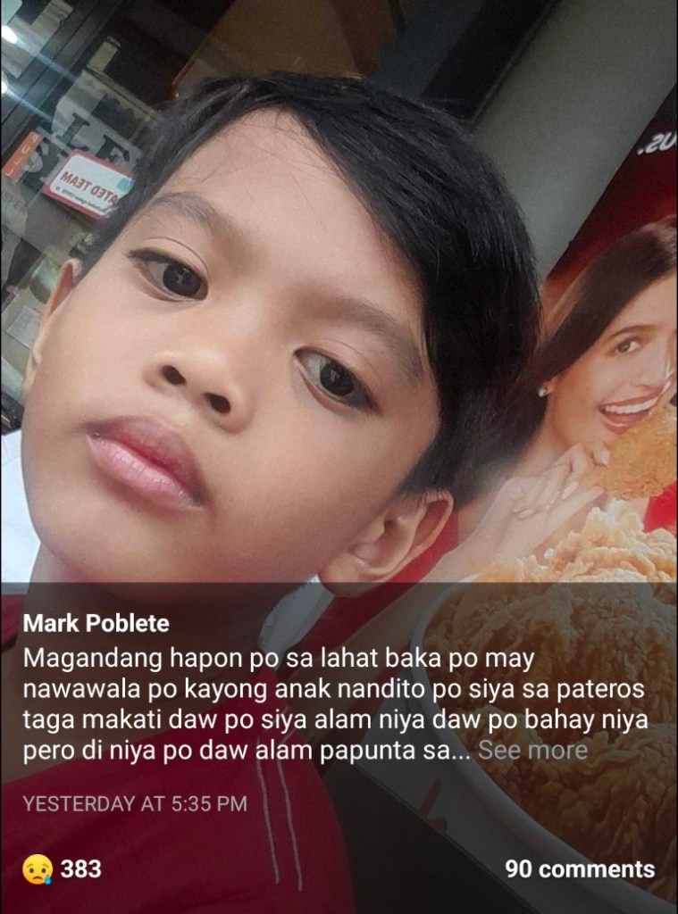 “Magandang hapon po sa lahat baka po may nawawala po kayong anak nandito po siya sa Pateros. Taga-Makati daw po siya, alam niya daw po bahay niya pero di niya po daw alam papunta sa kanila. Umalis daw po siya ng bahay nila kasi pupuntahan niya daw po nanay kung saan po ang work ng nanay niya. Naligaw po siya,” shared Mark Poblete, a concerned citizen, along with a photograph of James, seeking assistance in locating his family.