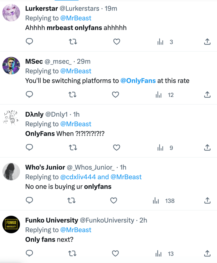 As the thread continues, various verified users join in with their amusing comments. From jokes about MrBeast’s pose to suggestions like starting an OnlyFans account (in a complimentary way, of course), the Twitterverse is having a field day with MrBeast’s remarkable progress.