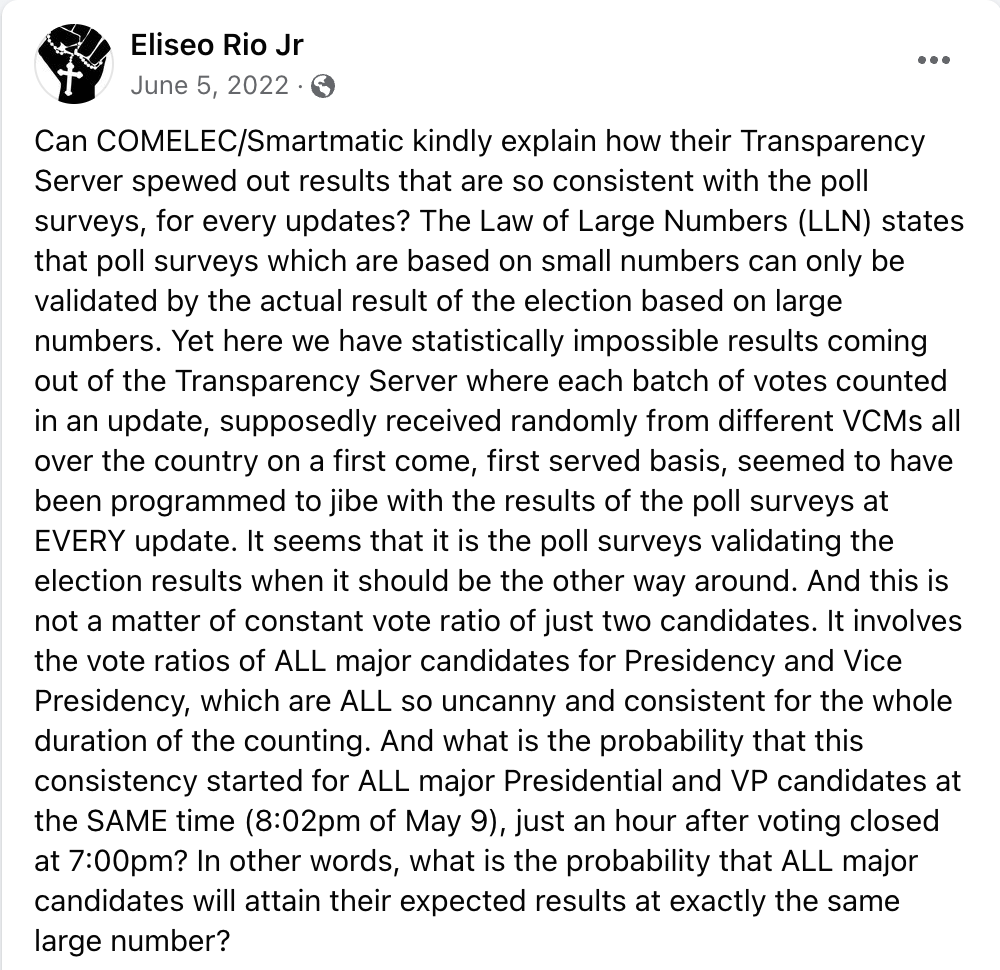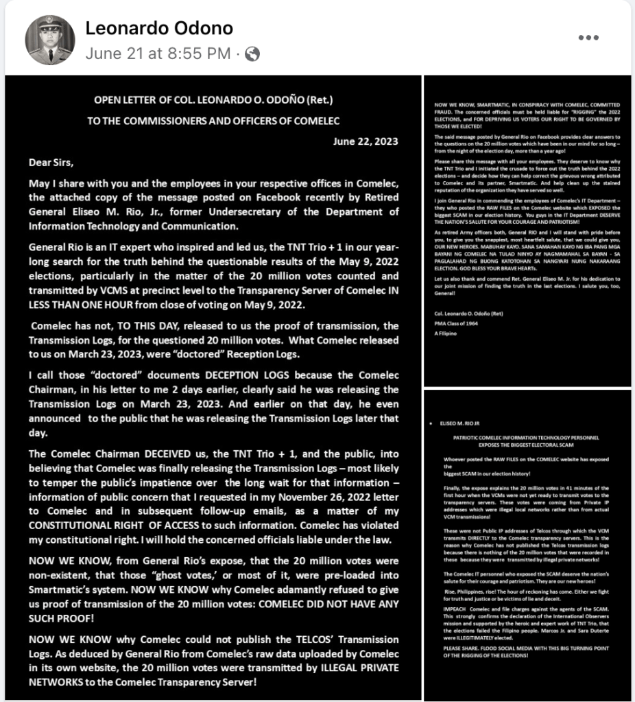 Citing a recent Facebook post by Retired General Eliseo M. Rio Jr., a former Undersecretary of the Department of Information Technology and Communication, Colonel Odoño sheds light on the suspicious transmission of 20 million votes within an implausibly short timeframe.