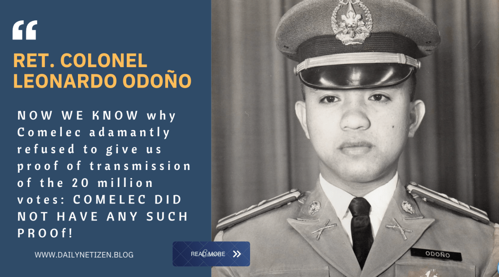 According to the revelations made by General Rio, the 20 million votes in question were non-existent and had been pre-loaded into Smartmatic’s system. Colonel Odoño emphasizes that COMELEC’s refusal to provide evidence of transmission casts serious doubt on the integrity of the entire election process. He states, “NOW WE KNOW why Comelec adamantly refused to give us proof of transmission of the 20 million votes: COMELEC DID NOT HAVE ANY SUCH PROOF!”