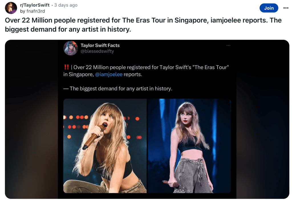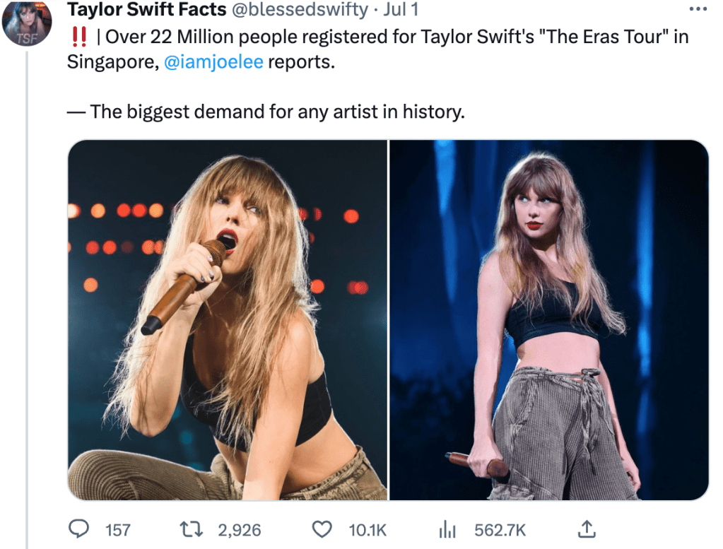 However, it seems that even these impressive numbers pale in comparison to the viral Twitter post that surfaced recently. Though unverified, the post claims that a staggering 22 million fans have pre-registered for Taylor’s ticket sales in Singapore.