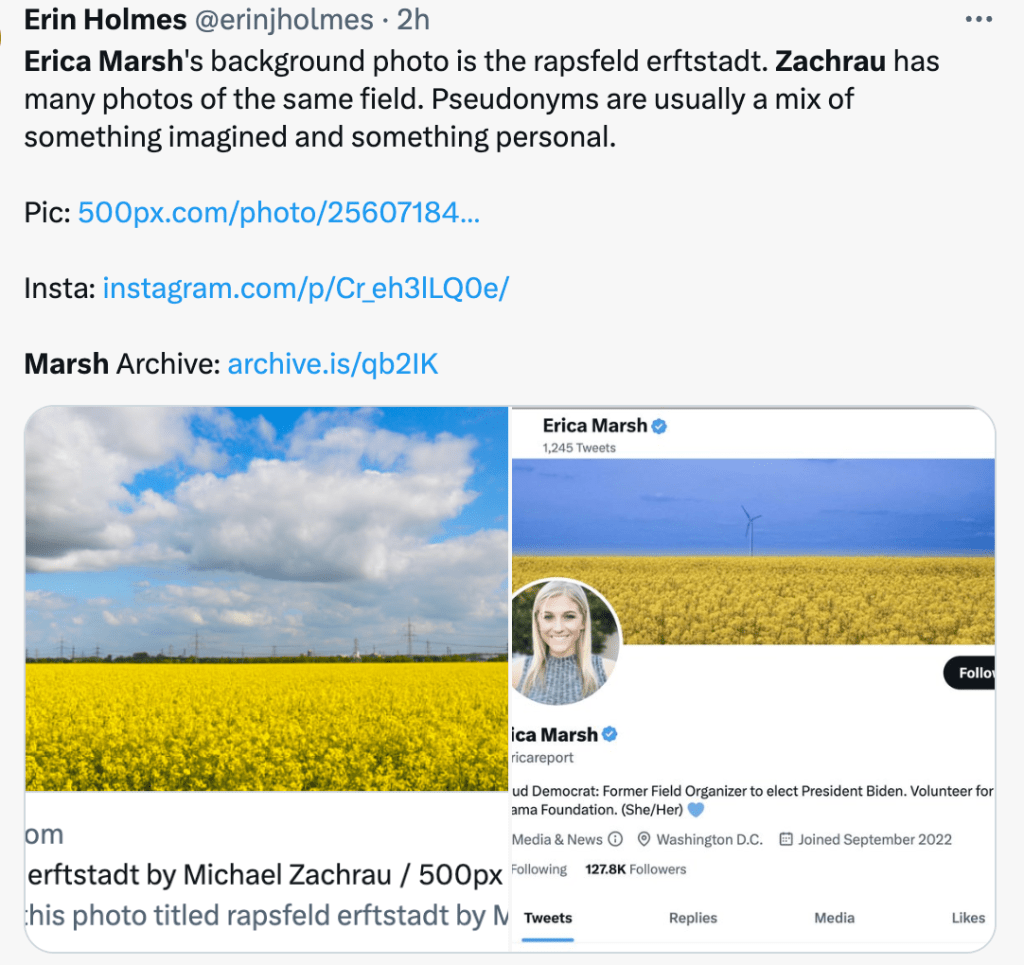 Others on Twitter had also independently discovered the true identity behind the controversial account. Credit is also due to a verified Twitter personality, Greg Boulden, who made a critical statement regarding Erica Marsh: “This person does not exist… This is election interference starting early.”