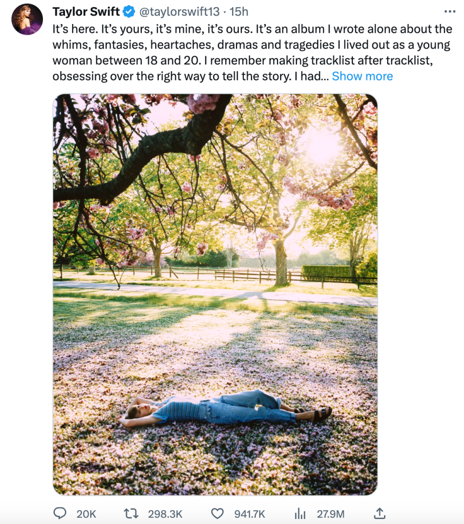 A simple tweet featuring a photo of her lying aimlessly on a bed of flowers, shaded by cherry blossoms, has taken the internet by storm. Garnering nearly 1 million likes, 270,000 retweets, and over 20,000 comments in just 17 hours, it’s evident that Swift’s influence remains as strong as ever.