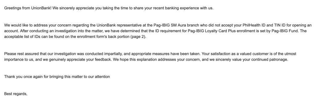Subsequently, I filed complaints with both Pag-Ibig and Union Bank. The government’s complaint center offered an apology and promised to investigate the matter. However, Union Bank’s Consumer Affairs Officer, James Belmonte, reached out to me yesterday via email, only to provide a different explanation.