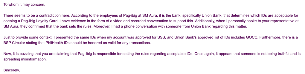 There seems to be a contradiction here. According to the employees of Pag-ibig at SM Aura, it is the bank, specifically Union Bank, that determines which IDs are acceptable for opening a Pag-Ibig Loyalty Card. I have evidence in the form of a video and recorded conversation to support this. Additionally, when I personally spoke to your representative at SM Aura, they confirmed that the bank sets the rules. Moreover, I had a phone conversation with someone from Union Bank regarding this matter.