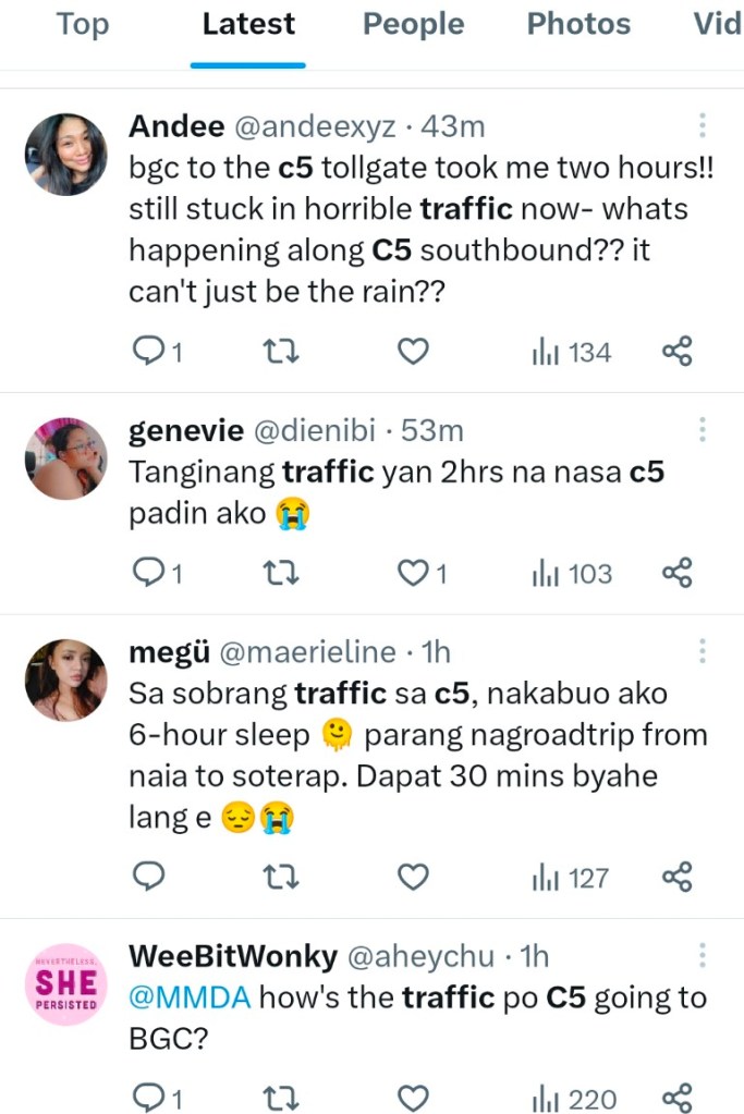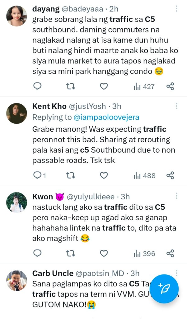 Another Twitter user, Dayang (@badeyaa), shared her harrowing experience, revealing, “grabe sobrang lala ng traffic sa C5 southbound. daming commuters na naglakad nalang at isa kame dun huhu buti nalang hindi maarte anak ko baba ko siya mula market to aura tapos naglakad siya sa mini park hanggang condo.” (The traffic on C5 southbound was extremely terrible. Many commuters resorted to walking, and I was one of them. Thankfully, my child didn’t complain as I made her walk from the market to Aura, then through the mini park all the way to our condo.)