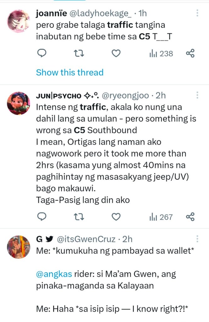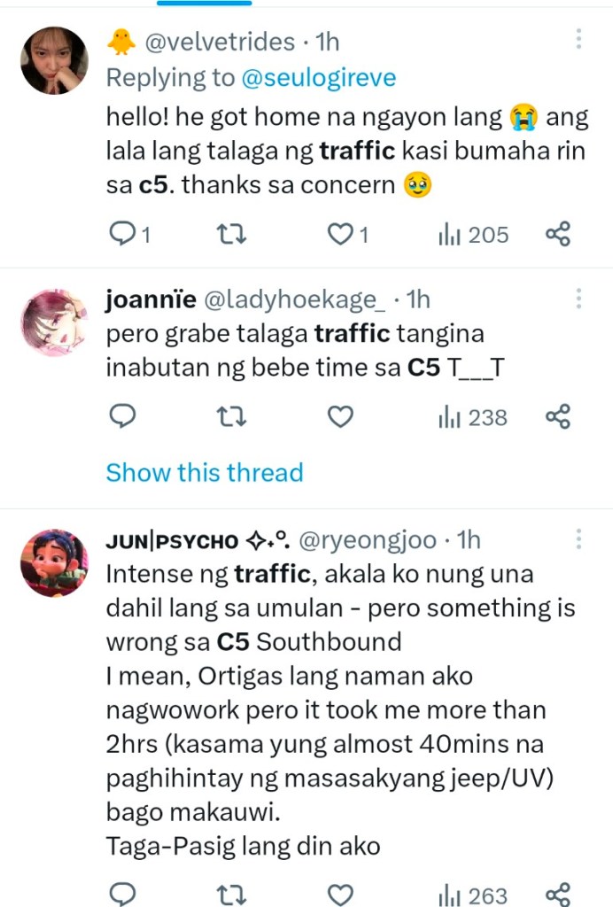 One Twitter user, Jun (@ryeongjoo), who experienced the traffic firsthand, voiced his disbelief, tweeting, “Intense ng traffic, akala ko nung una dahil lang sa umulan – pero something is wrong sa C5 Southbound. I mean, Ortigas lang naman ako nagwowork pero it took me more than 2hrs (kasama yung almost 40mins na paghihintay ng masasakyang jeep/UV) bago makauwi. Taga-Pasig lang din ako.” (The traffic was intense. At first, I thought it was just because of the rain, but there’s something wrong with C5 Southbound. I work in Ortigas, and it took me more than 2 hours, including the almost 40 minutes of waiting for a jeepney/UV ride, before I could get home. I’m also from Pasig.)