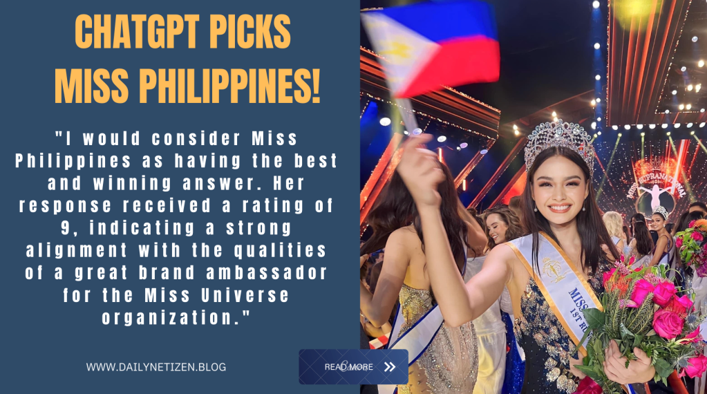 But when pressed to pick only one winning answer, ChatGPT gave the crown to Miss Philippines, contending: “I would consider Miss Philippines as having the best and winning answer. Her response received a rating of 9, indicating a strong alignment with the qualities of a great brand ambassador for the Miss Universe organization. However, please note that this is an opinion based on the information given and does not reflect the actual judgment of the Miss Universe pageant or its judges.”