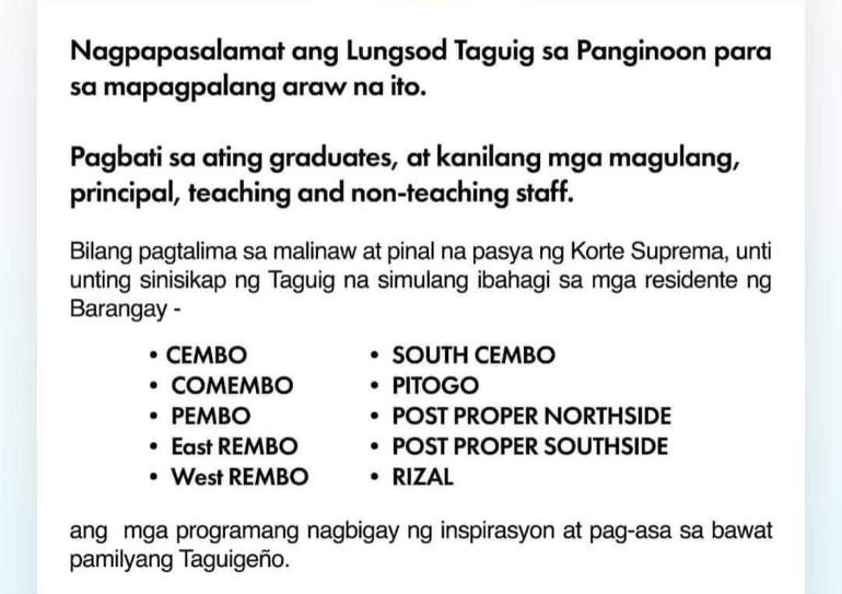The SC ruling confirms that Parcels 3 and 4, Psu 2031, comprising Fort Bonifacio, including the so-called Inner Fort comprising Barangays Pembo, Comembo, Cembo, South Cembo, West Rembo, East Rembo, and Pitogo, are now confirmed to be part of the territory of the City of Taguig.