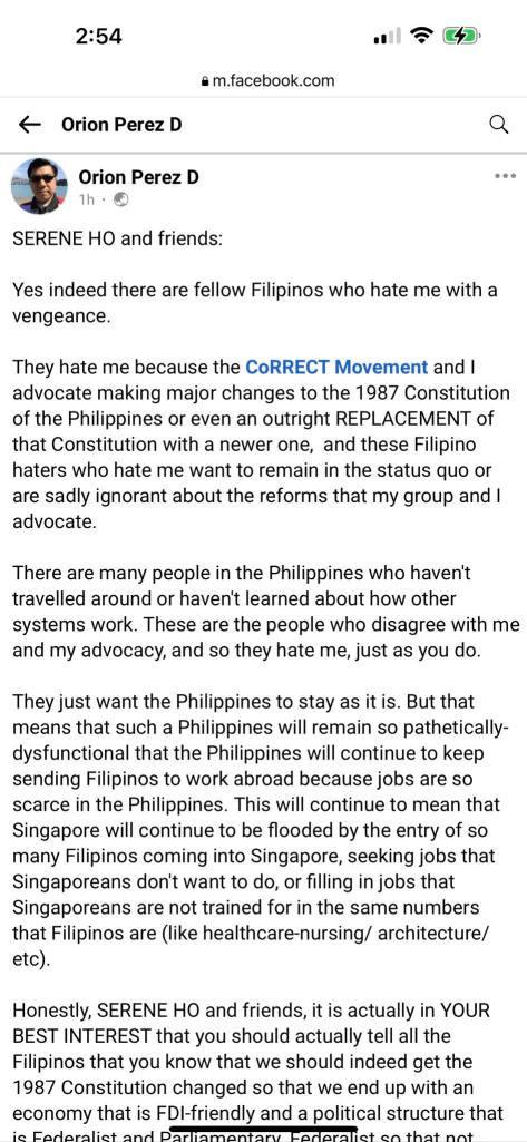 Orion Perez Dumdum, an OFW known for his assertive promotion of the parliamentary system in the Philippines, saw an opportunity to further his own agenda by seizing upon a disagreement with Serene Ho.