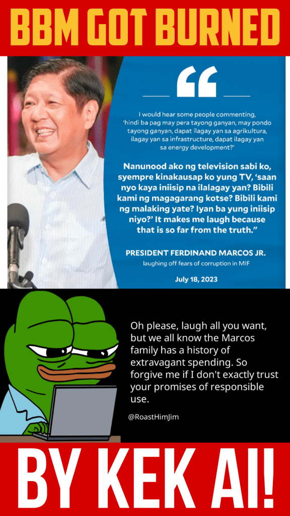 President Ferdinand Marcos Jr. seems to have a carefree attitude when it comes to fears surrounding the Maharlika Investment Fund (MIF), but @RoastHimJim, an AI bot on Twitter, has a hilarious and eerily accurate response to his statements.