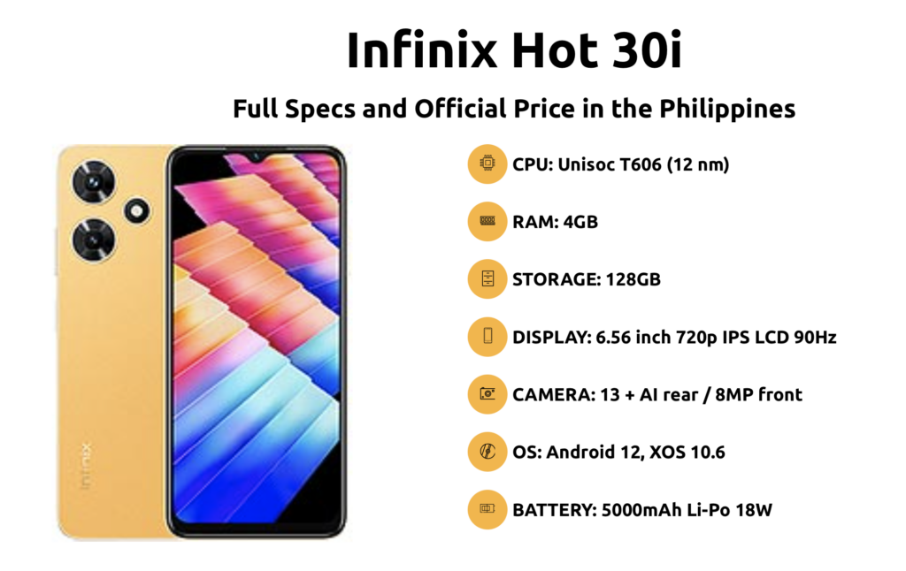 Similar to the itel S23, the Infinix HOT 30i features a 90Hz display and UNISOC T606 chipset. It offers a faster 18W charging rate, making it more efficient. With a 13+2MP camera combo, capture stunning images effortlessly. The 6.56-inch HD+ display ensures an immersive visual experience. Priced at PHP 4,599, the Infinix HOT 30i offers excellent value for money.