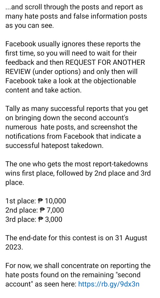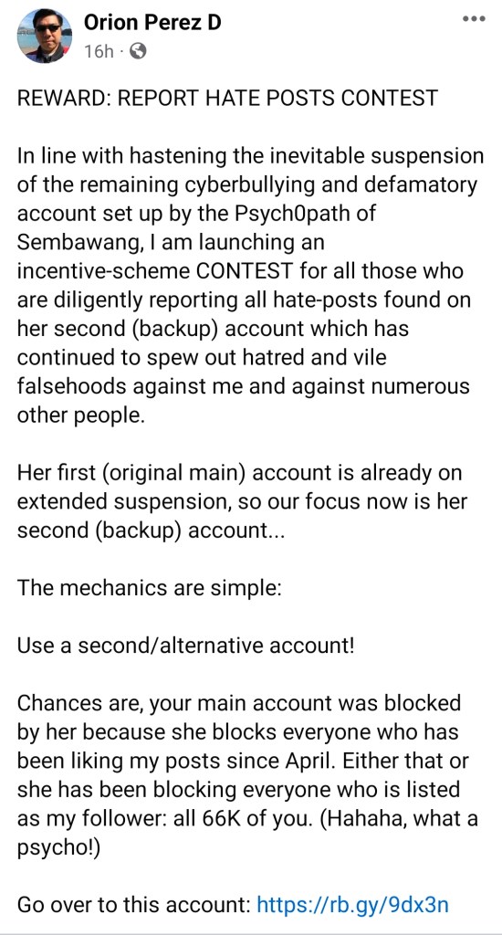 The contest involves encouraging his Facebook friends and fellow Filipinos to cyber-bully and maliciously report a Singaporean national named Serene Ho with whom he simply disagrees.