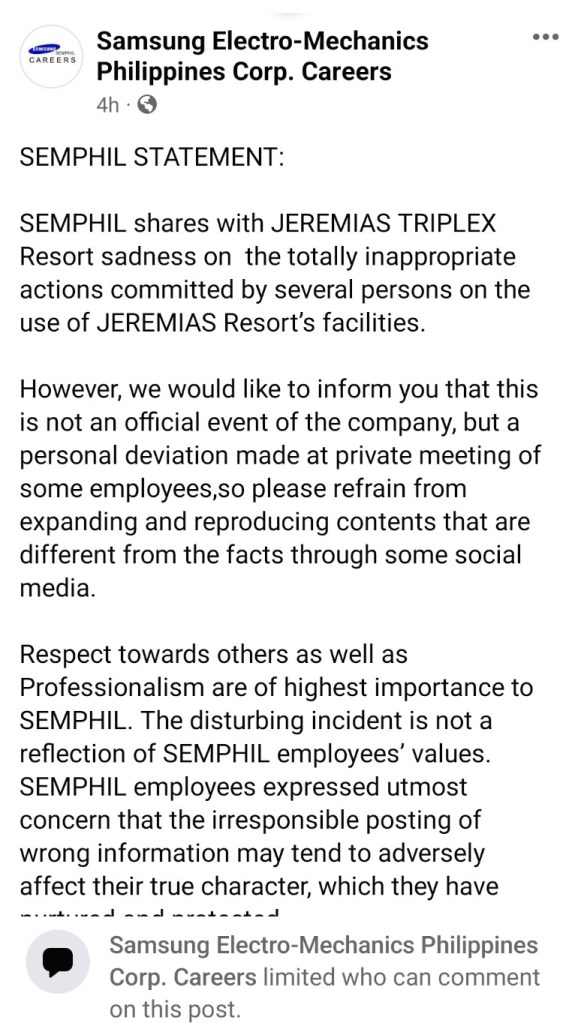 “SEMPHIL shares with JEREMIAS TRIPLEX Resort sadness on the totally inappropriate actions committed by several persons on the use of JEREMIAS Resort’s facilities,” the statement read, sparking a flurry of reactions from the online community.