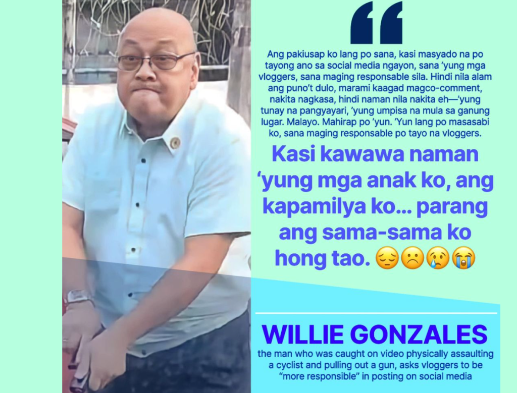 Jhun Conga also chimed in, posted: “Hoy KALBONG Wilfredo Willie Gonzales, mahiya ka namang hayup ka. May statement ka pa na maging responsable ang mga vlogger dahil naapektuhan ang mga anak mo? Punyeta ka, bakit hindi ka maging responsableng gun owner bago mo punahin ang mga vlogger na hayup ka. Gagawa ka ng karahasan, tapos ng kumalat sa social media eh paawa effect dahil apektado ang mga anak mo sa kagagohan mo?”