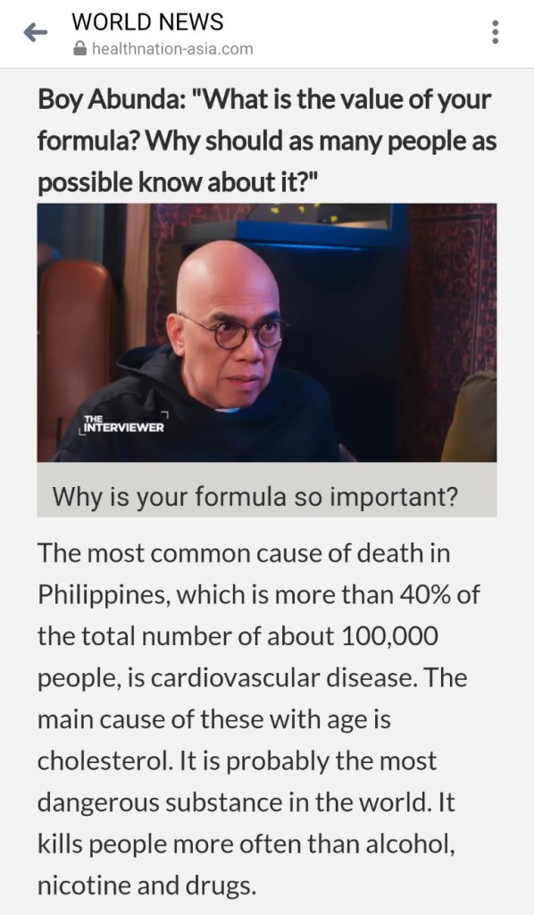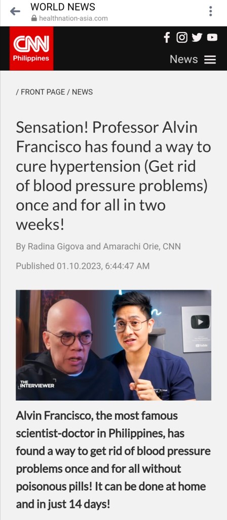 The lead paragraph of the article declares, “Alvin Francisco, the most famous scientist-doctor in the Philippines, has found a way to get rid of blood pressure problems once and for all without poisonous pills! It can be done at home and in just 14 days!”