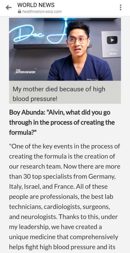 Moreover, it employs emotional appeals by claiming that Dr. Francisco was driven to make this discovery due to his mother’s struggle with severe hypertension and personal tragedy, even alleging that he turned down a $120,000 offer from a global pharmaceutical company.