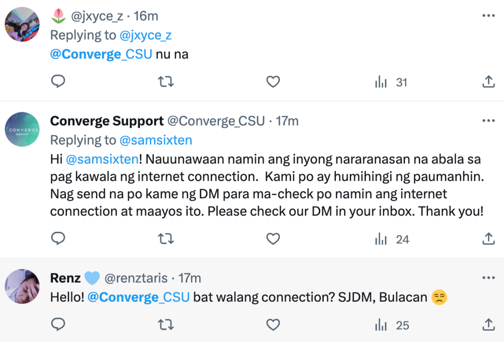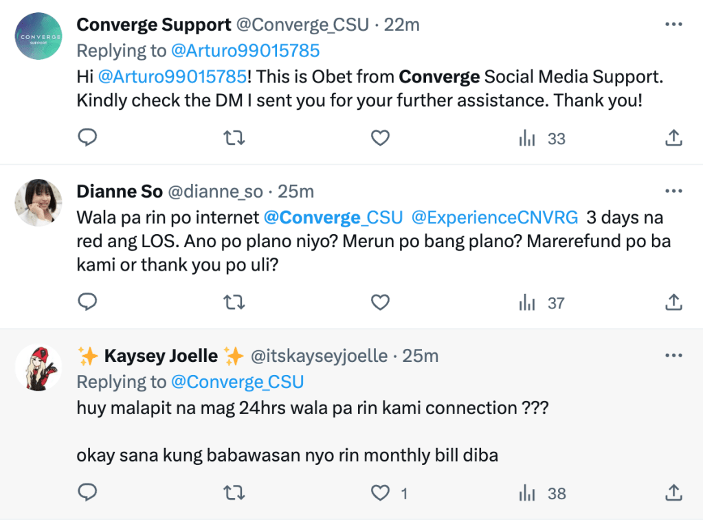 One frustrated user questioned, “We still have no internet, @Converge_CSU @ExperienceCNVRG. It’s been 3 days with a red LOS (Loss of Signal). What’s your plan? Will we be refunded, or just another thank you?”