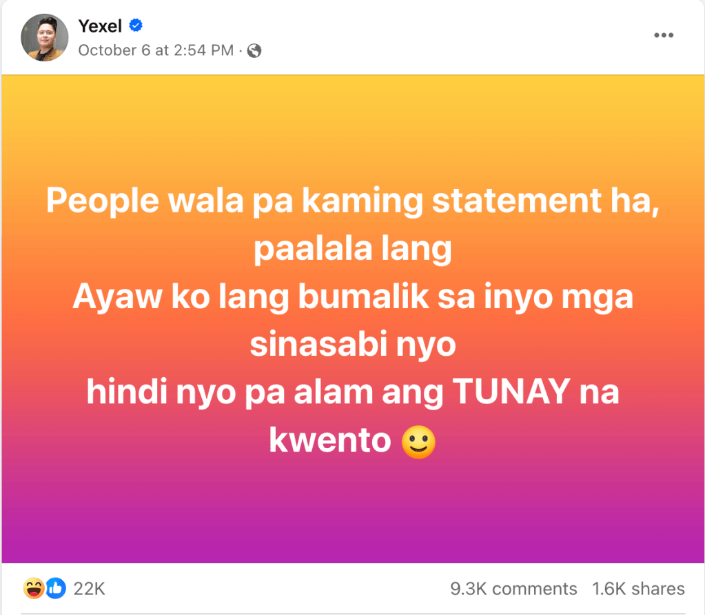In his Facebook post Friday, Sebastian seemed defiant as he stated, “People wala pa kaming statement ha, paalala lang. Ayaw ko lang bumalik sa inyo mga sinasabi nyo hindi nyo pa alam ang TUNAY na kwento,” (“People, we haven’t issued a statement yet, just a reminder. I don’t want to respond to your allegations until you know the REAL story.”)