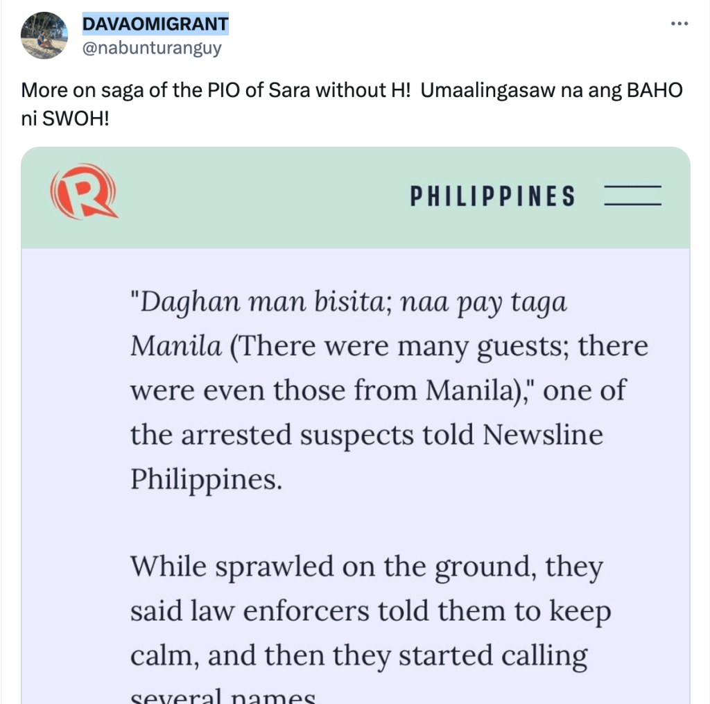 To his credit, DAVAOMIGRANT shared a screenshot of a Rappler story with the tweet: “More on the saga of the PIO of Sara without H! Umaalingasaw na ang BAHO ni SWOH!”
