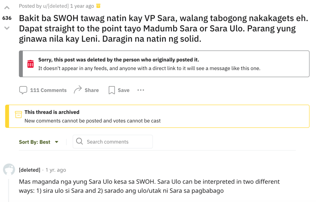 The entry reads: “This means ‘Sara Without Honesty.’ It slightly alludes to her name not being spelled the typical Filipino way (Sarah) and also refers to one of her interviews in which she stated that ‘honesty is not needed for elected officials.'” It was first posted on May 20, 2022, by a user named yyooimu.