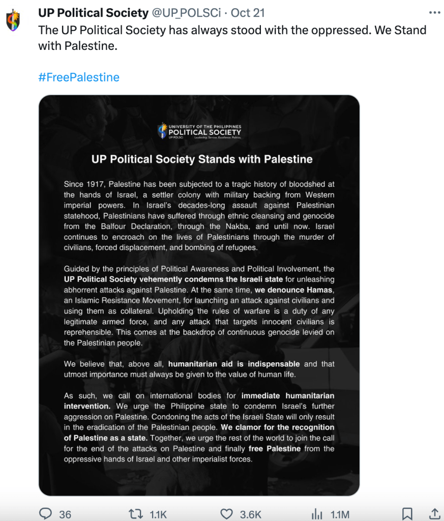 In an October 21 post, UP PolSoc, representing one of the Philippines’ top universities, made a bold statement regarding the ongoing Israel-Hamas war.