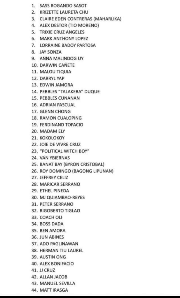 The names on the list include former Marcos spokesperson Trixie Cruz-Angeles, Mark Anthony Lopez, Lorraine Badoy Partosa, Jay Sonza, Pebbles Cunana, Ferdinand Topacio, Sass Rolando Sasot, among others. However, the poster did not provide any evidence to support the claim that the pro-Duterte individuals on the list parrot China’s propaganda.