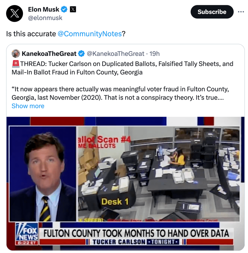 The post in question, titled “Tucker Carlson on Duplicated Ballots, Falsified Tally Sheets, and Mail-In Ballot Fraud in Fulton County, Georgia,” originated from political pundit KanekoaTheGreat, a verified user with over 600,000 followers.