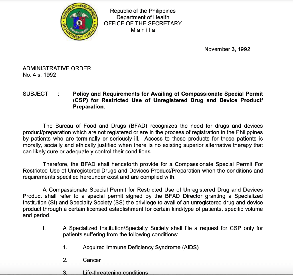 The Department of Health Administrative Order No. 4 s. 1992 recognizes the need for unregistered drugs for terminally or seriously ill patients, allowing special permits for specific cases.