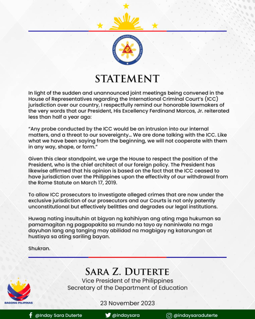 In response to this development, Vice President Sara Duterte, daughter of the former president, issued a statement on November 23, reacting to a House resolution urging government cooperation with the ICC probe into her father’s drug war.