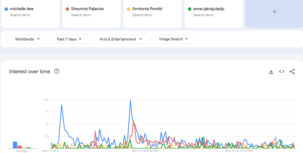 Google Trends data confirms that Michelle Dee has become a global sensation, surpassing not only the crowned winner, Sheynnis Palacios, but also outshining other personalities like Miss Thailand Anntonia Porslid and franchise owner Anne Jakrajutatip.