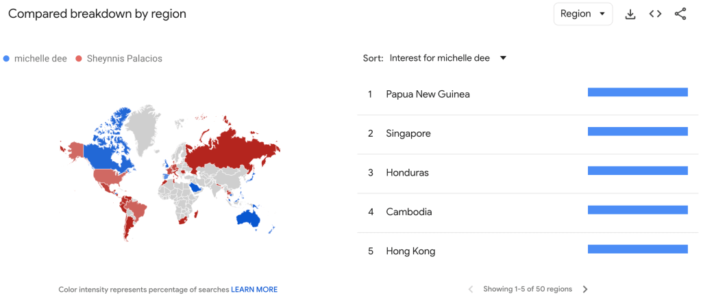 Breakdown by region indicates that Michelle Dee is most popular in Australia, Canada, Saudi Arabia, and the United Kingdom, while Palacios is more favored in Russia, Argentina, and Peru.