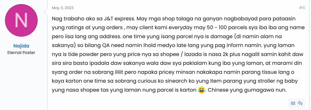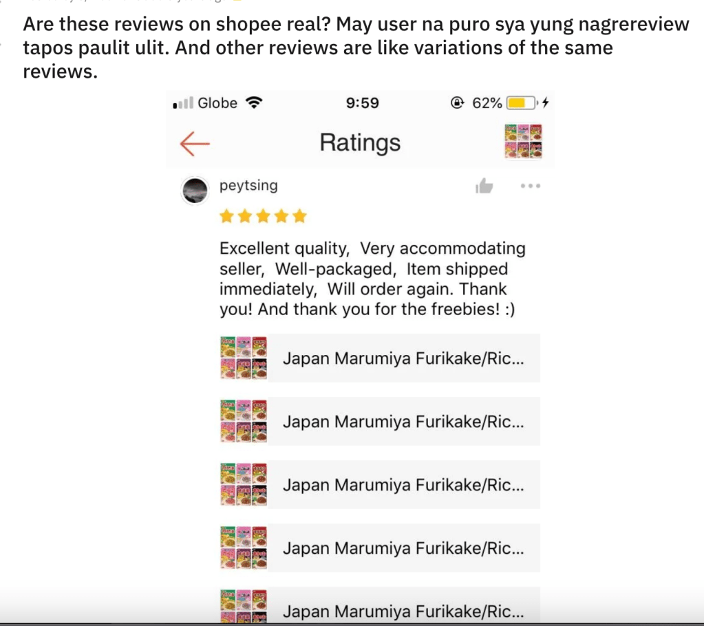 Scrutinize reviews in Tagalog. If they read or sound like they were translated from a foreign language, it’s likely a fake review, especially considering many sellers on these platforms are from China. - Scripted Reviews:
