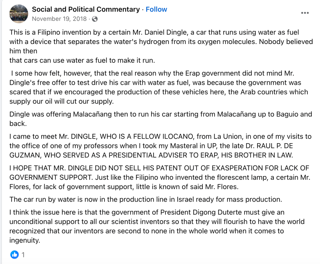 You’ve likely encountered the narrative of a purported groundbreaking Filipino invention — a car that uses water as fuel. To this day, many Filipinos still believe in its authenticity, attributing its failure to materialize to a lack of government support and financial backing.