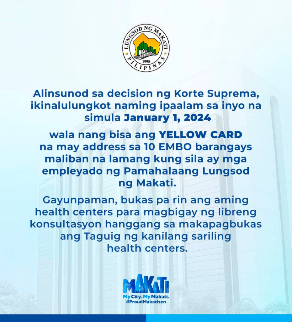 In a Facebook post, the Makati City government conveyed the unfortunate news in accordance with the Supreme Court’s ruling: “Alinsunod sa decision ng Korte Suprema, ikinalulungkot naming ipaalam sa inyo na simula January 1, 2024 wala nang bisa ang YELLOW CARD na may address sa 10 EMBO barangays maliban kung sila ay mga empleyado ng Pamahalaang Lungsod ng Makati.”