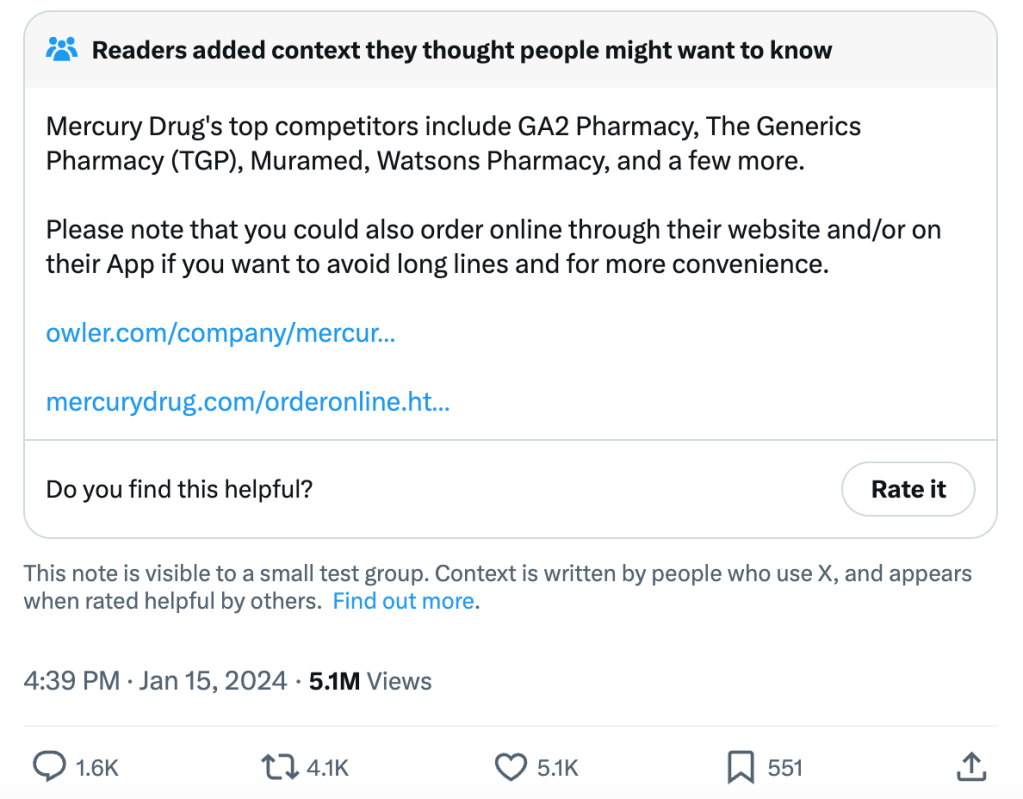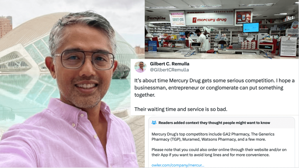 A Community Note appended to his post provided a list of Mercury Drug’s top competitors, including GA2 Pharmacy, The Generics Pharmacy (TGP), Muramed, and Watsons Pharmacy.