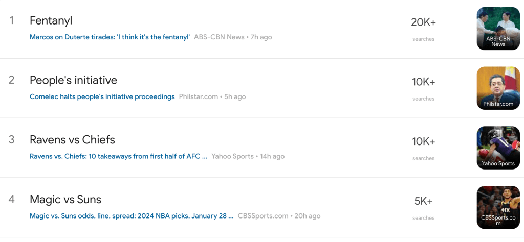 This revelation triggered a surge in online searches, making “Fentanyl” the top trending term on Google, followed by “people’s initiative” and “Ravens vs Chiefs.”