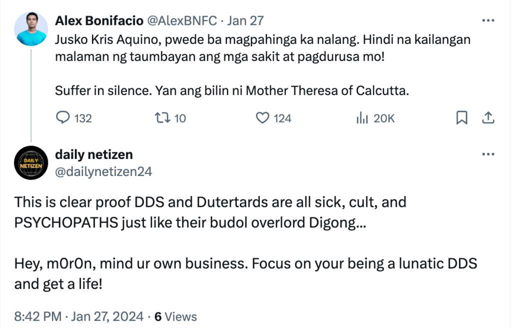 This particular Duterte troll, known as Alex Bonifacio, took offense at The Daily Netizen’s exposure of his disgraceful behavior towards veteran actress Kris Aquino, a beloved figure in the Philippines.