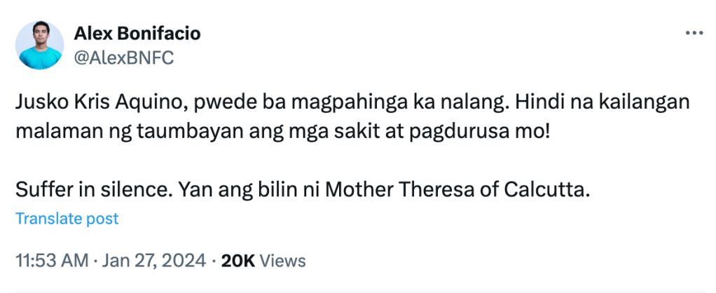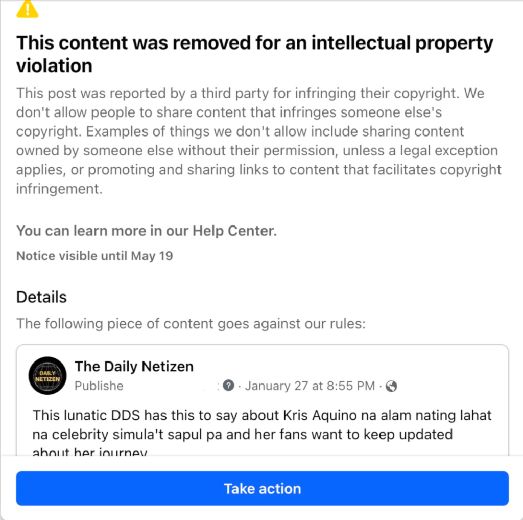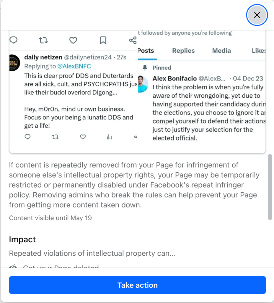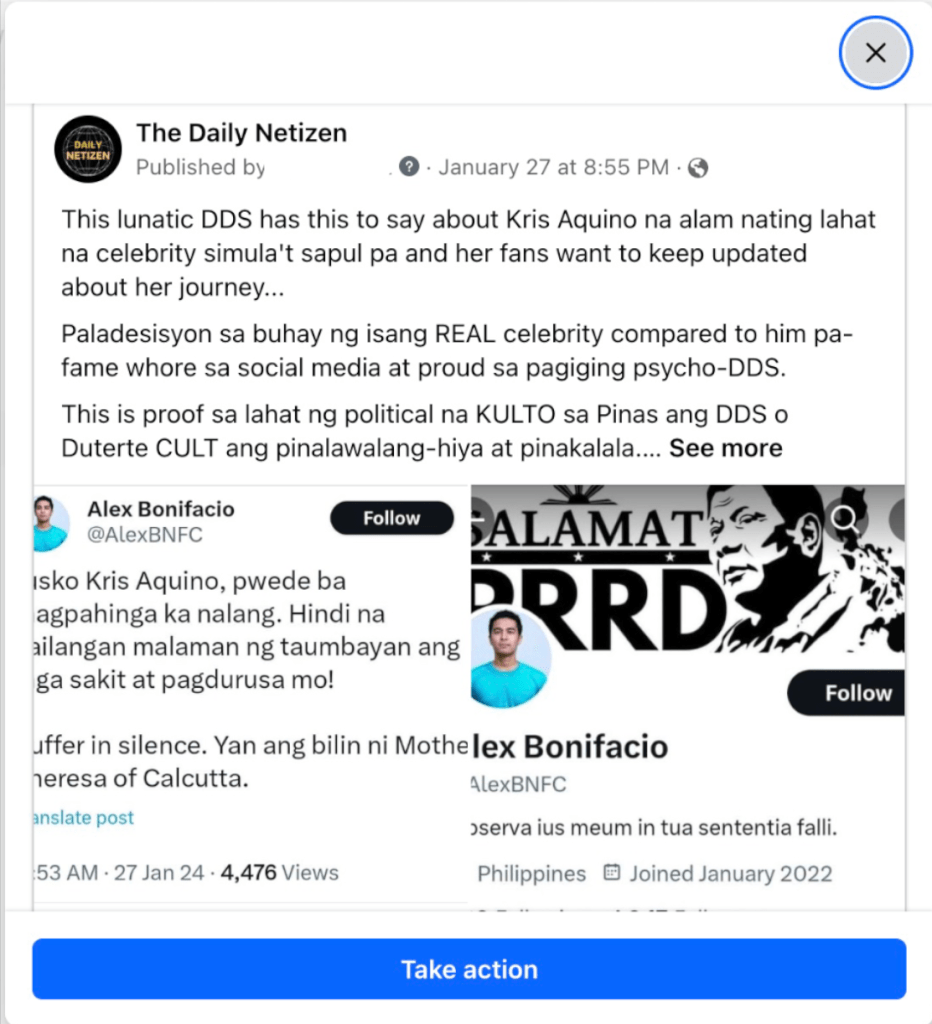 We are writing to appeal the copyright infringement complaint filed against a screenshot we posted on Facebook. The screenshot in question depicts Twitter posts made by Alex Bonifacio, a known political (allegedly) fake news peddler, targeting veteran actress Kris Aquino. The posts illustrate Mr. Bonifacio’s mockery and disdain towards Ms. Aquino, particularly regarding her health condition, with phrases such as “suffer in silence.”