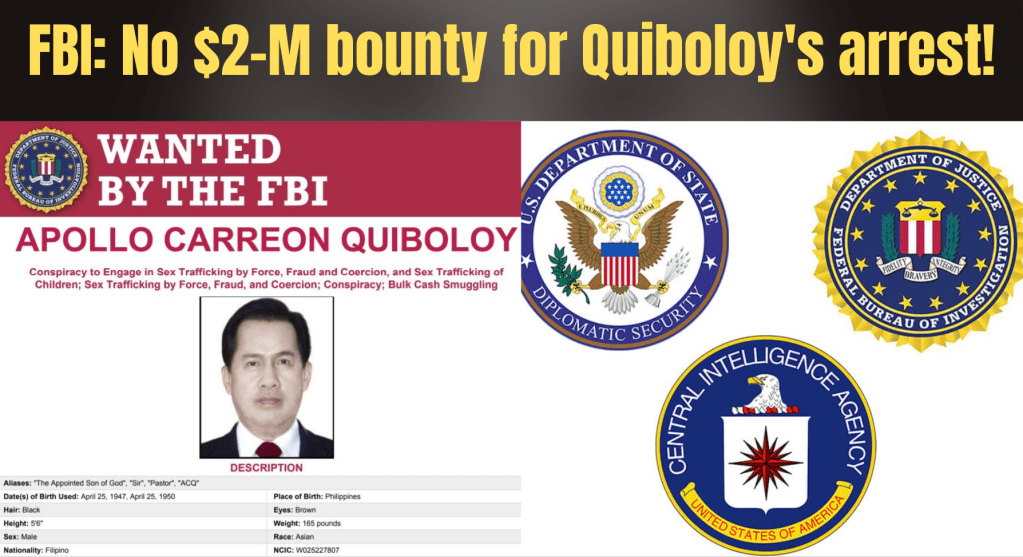 Laura Eimiller, a Public Affairs Specialist at the FBI, denied rumors of a $2-million bounty for the arrest of Quiboloy and his two associates, Teresita Dandan and Helen Panilag, GMA News reported.