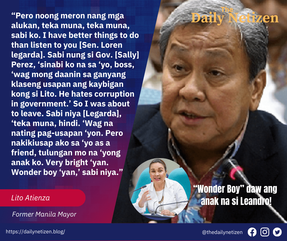 “Meron nang mga alukan,” Atienza said, recounting how he tried to walk out when the discussion turned to the franchise. Legarda allegedly pleaded with him to support the application for her “very bright” son, whom she called a “wonder boy,” as a favor. [WATCH the video for the whole story]