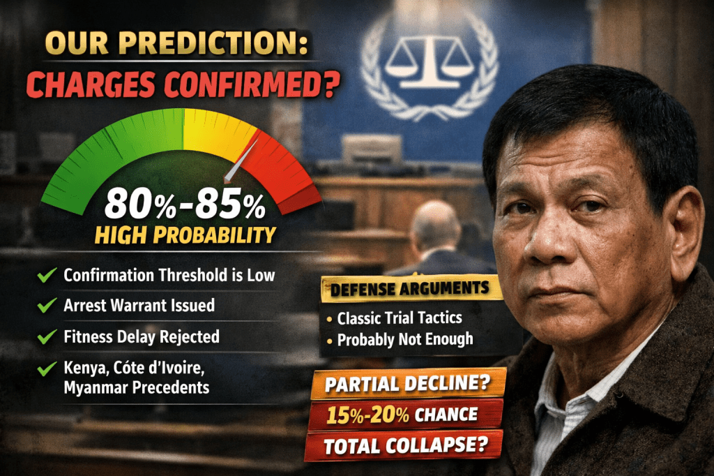 High probability, 80–85% na ma-confirm ang charges. Low threshold, arrest warrant na na-issue, at na-reject ang procedural delay. Defense arguments mostly technical; unlikely na mapigilan ang confirmation.